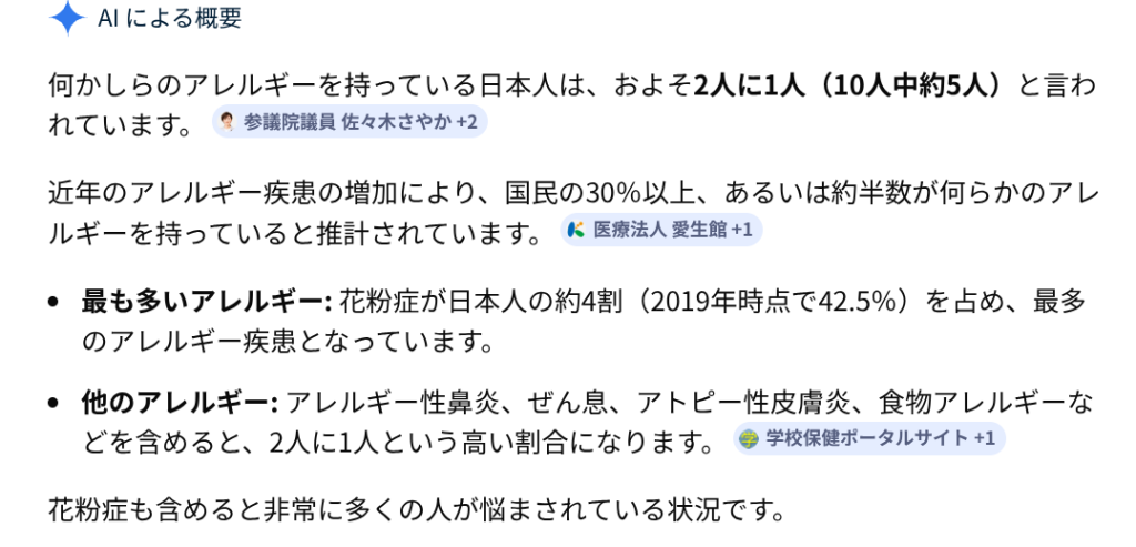 上記、AIの回答からも分かるように、現代人は何かしらのアレルギーを持っている人が相当で、